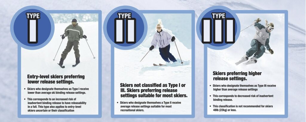 Skier type is a value you choose (1, 2, or 3) that affects your ski binding release setting. The goal is to calibrate the bindings so that your boot will release under abnormal force (a fall) while staying clipped in during normal skiing. The easiest way to figure out your type is to compare your skiing to these images: