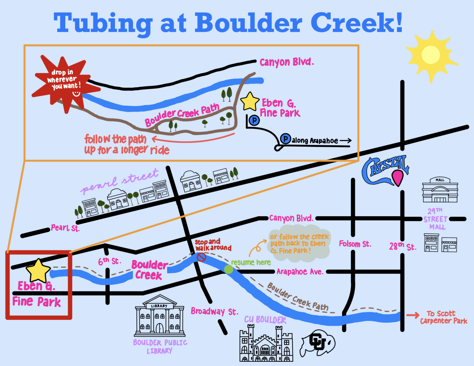 There are many great locations to tube creeks along the front range, including in Boulder, Lyons, Golden, and more. Many have curated sections that are built to float and nice walkways up and down the creeks. Ask us for some recommendations of where and when to go!